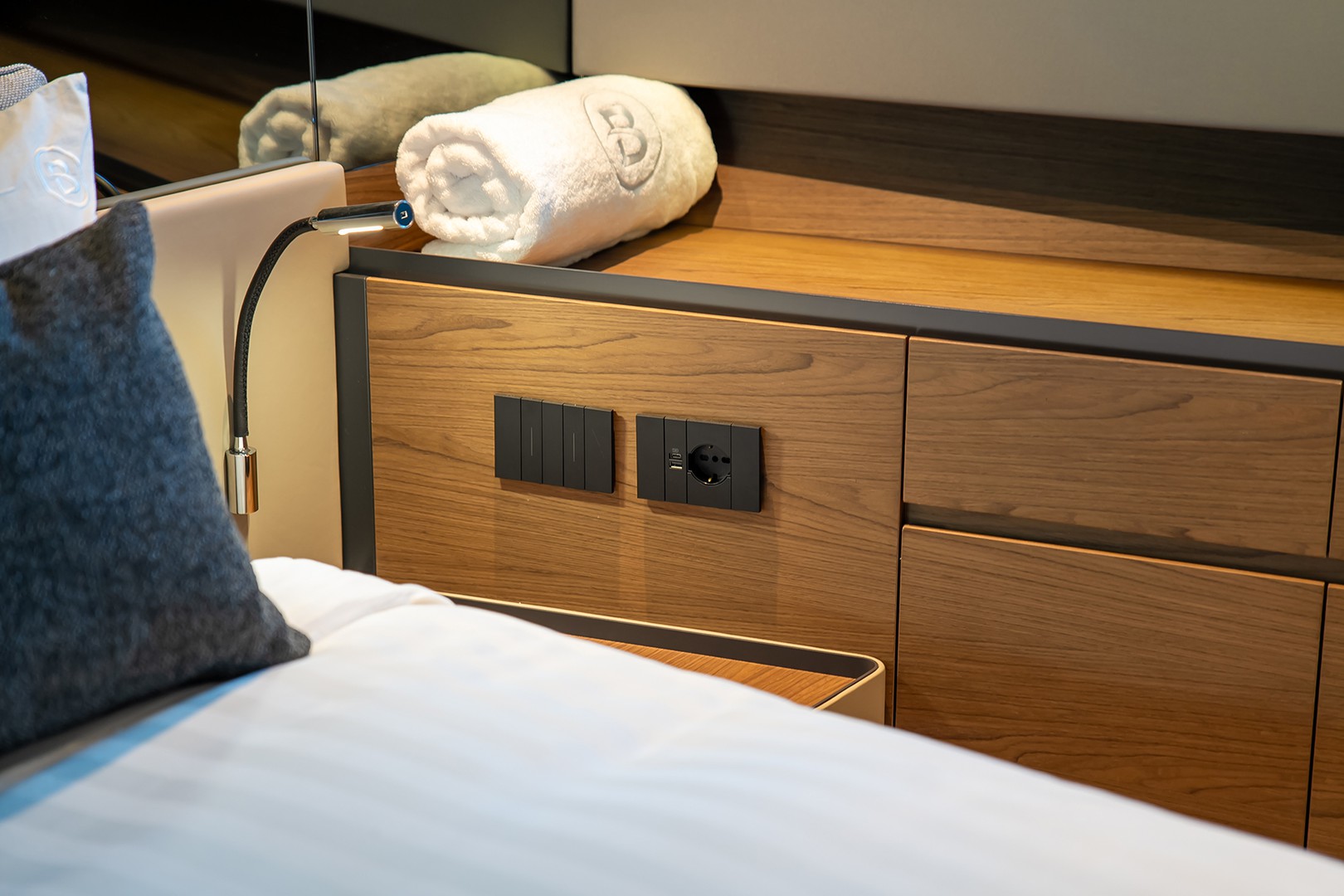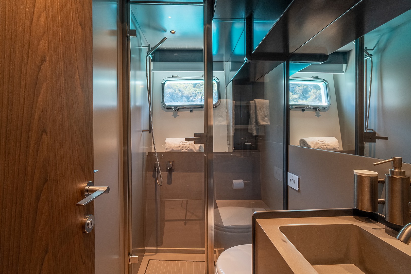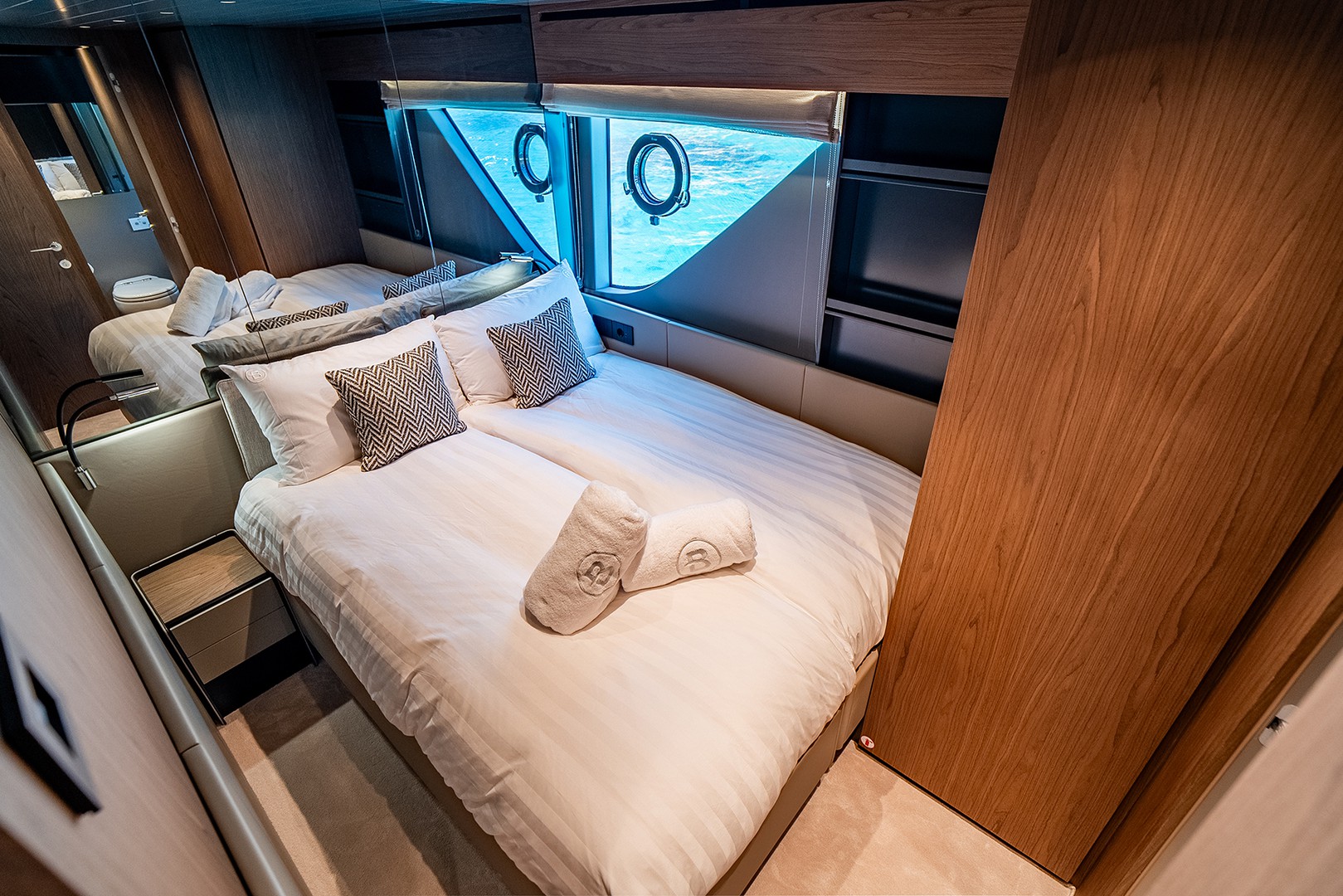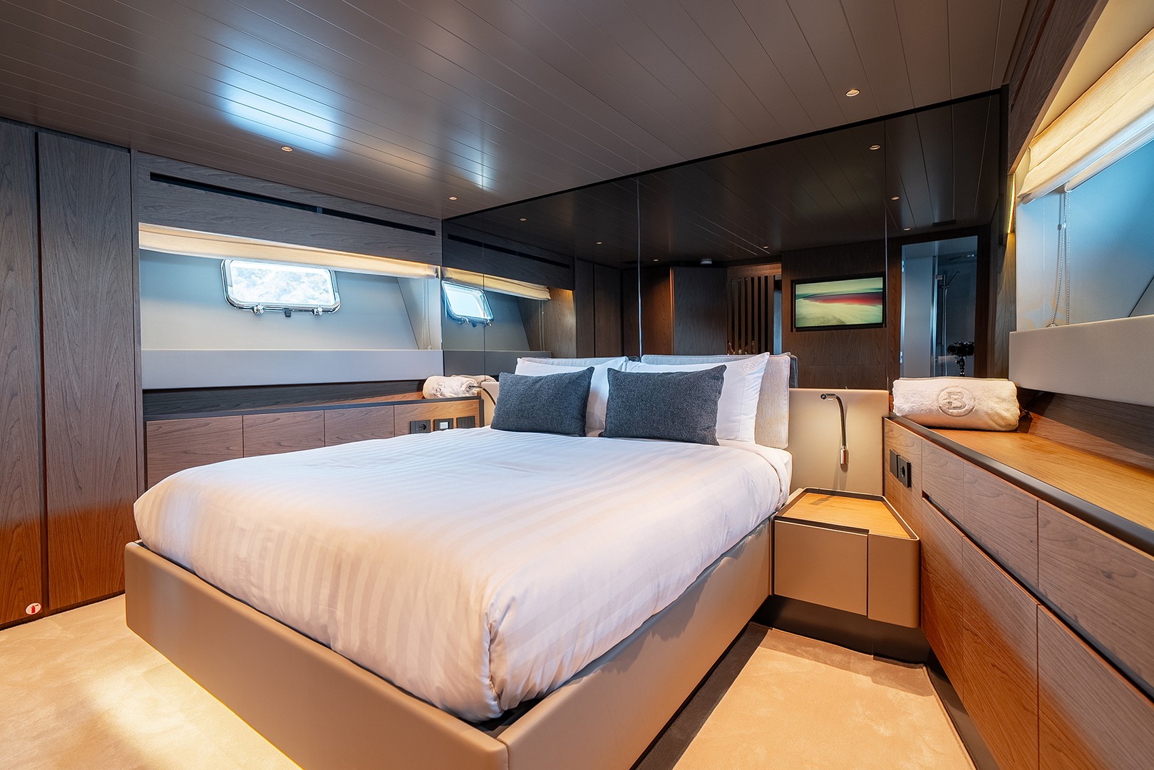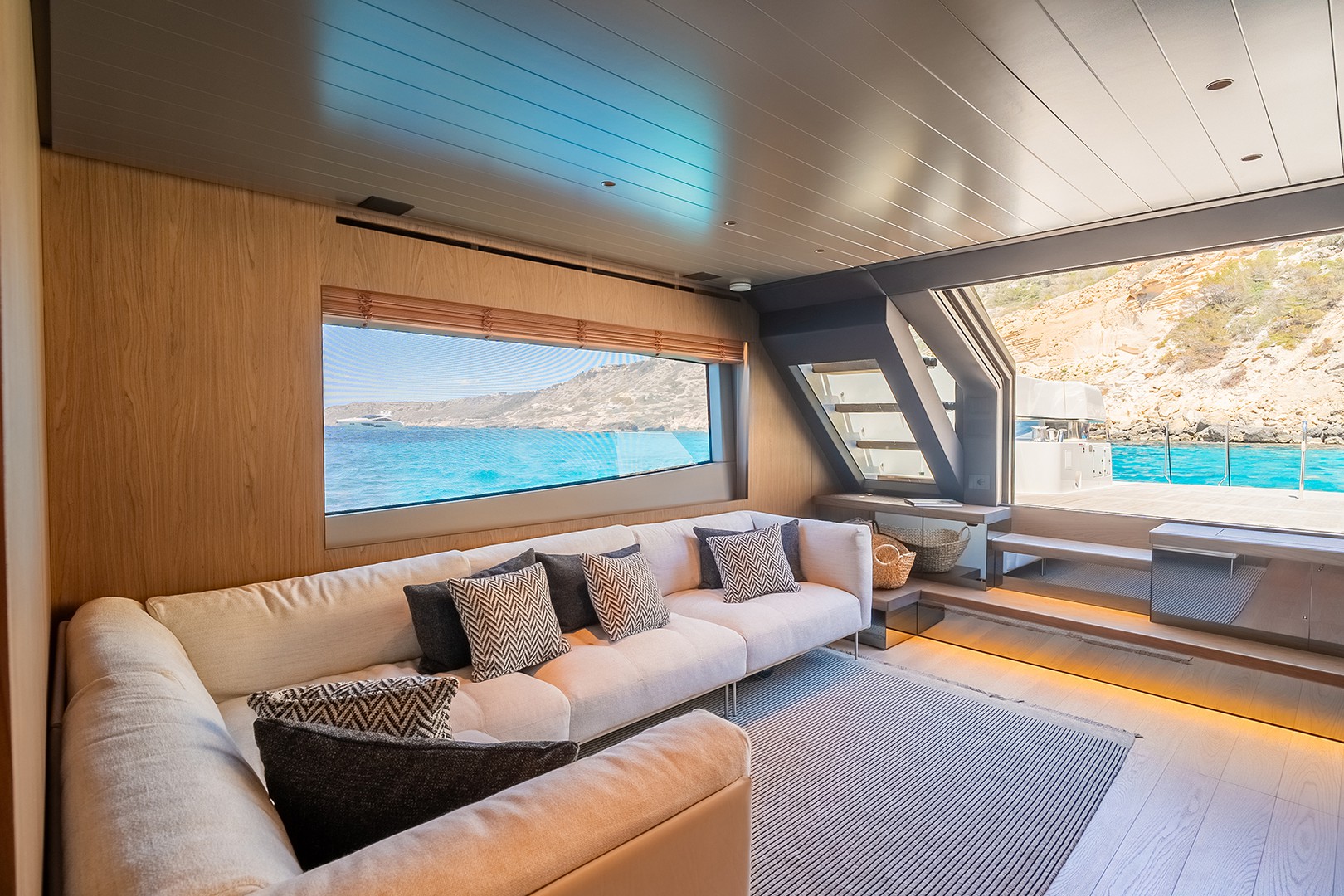 From Canaletto walnut accents to soft leather textures and calming blue hues, every detail has been curated to evoke relaxed elegance. Her spacious saloon opens directly to the sea, blending indoor luxury with ocean breeze in perfect harmony.
