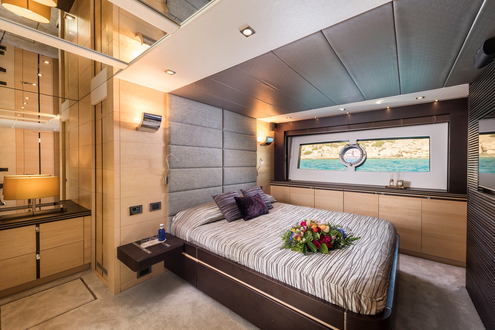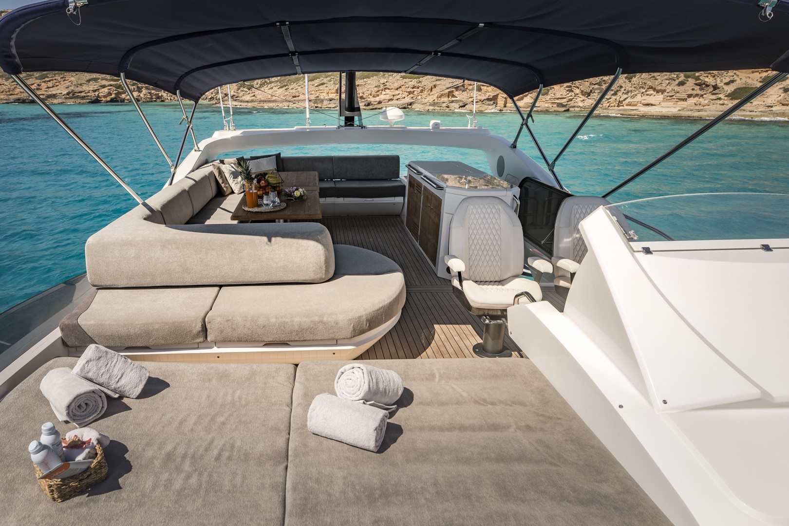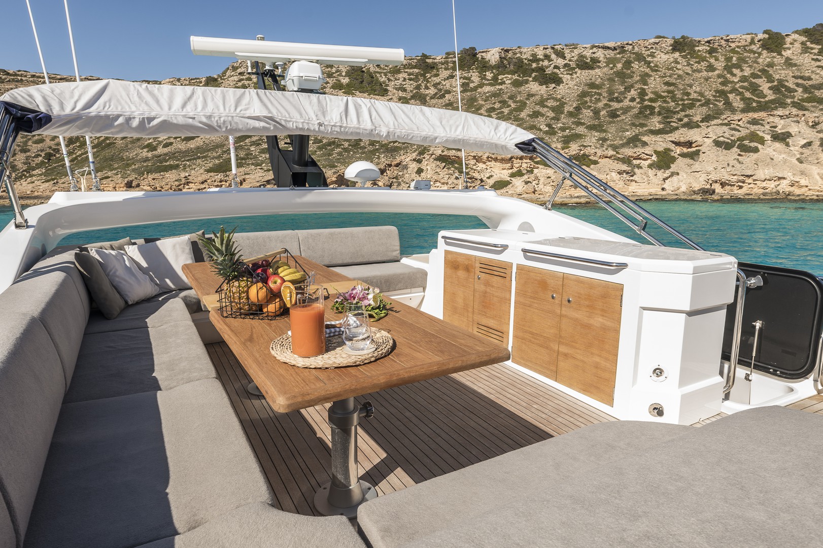 Bimini, Bow thruster, Cockpit speakers, Cockpit table, Dinghy, Electric winches, Electric windlass, Outside shower, Teak cockpit, Teak deck, Cockpit cushions, Coolbox, Bilge pump, Swim ladder, Bathing platform, Foredeck sun cushions, Hydraulic passerelle, Gangplank, Air compressor, Diving mask, Electric bilge pump, Gangway, Loudspeaker (outside), Shower on deck.