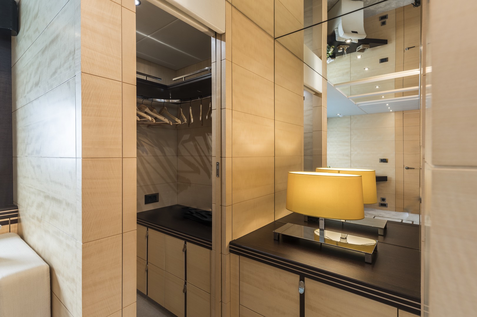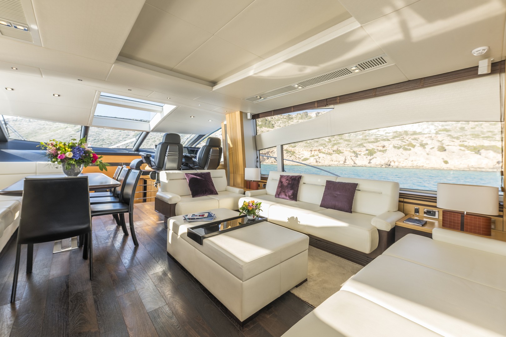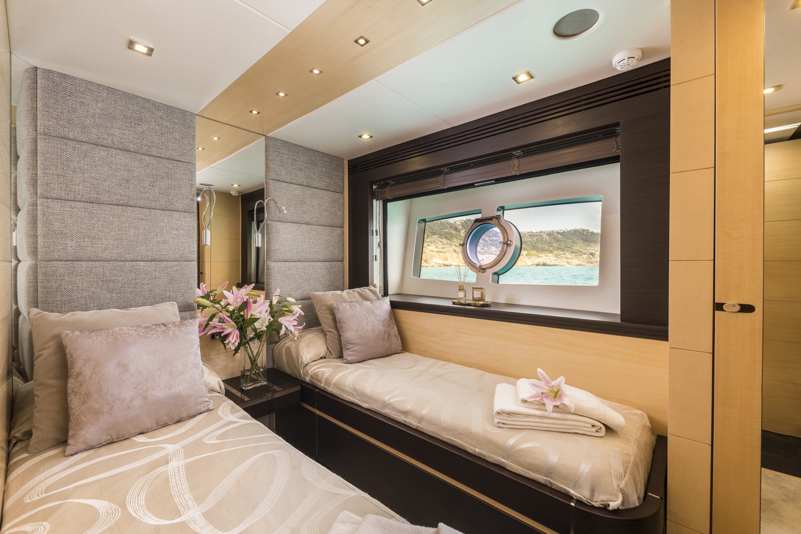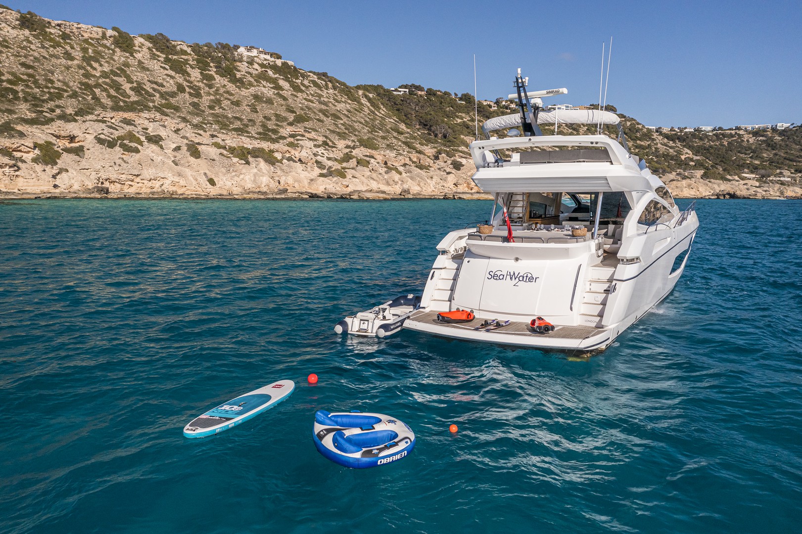 Bimini, Bow thruster, Cockpit speakers, Cockpit table, Dinghy, Electric winches, Electric windlass, Outside shower, Teak cockpit, Teak deck, Cockpit cushions, Coolbox, Bilge pump, Swim ladder, Bathing platform, Foredeck sun cushions, Hydraulic passerelle, Gangplank, Air compressor, Diving mask, Electric bilge pump, Gangway, Loudspeaker (outside), Shower on deck.